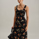 Zwart bloemenjurk met ruches en spaghetti bandjes in maxi-lengte